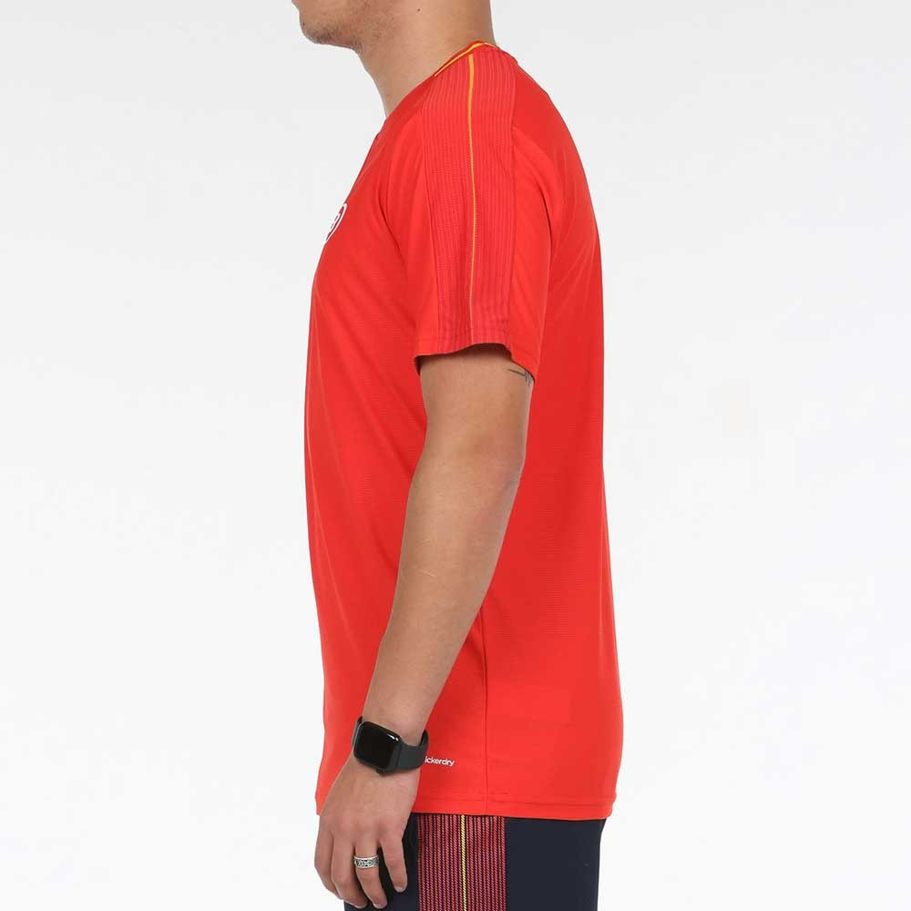 Maillot officiel de l’équipe nationale espagnole padel homme en rouge de la marque Bullpadel, version 2024 utilisée lors du championnat d’Europe et de la Coupe du monde de padel du Qatar.